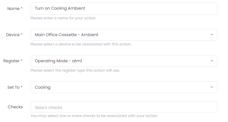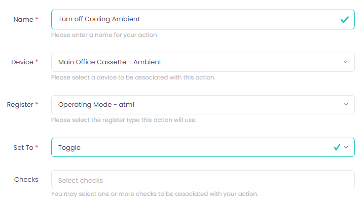 (Note: Our "Off" Action has the register atm1 being set to 'Toggle' as this will act as a "shut off" switch to the unit)