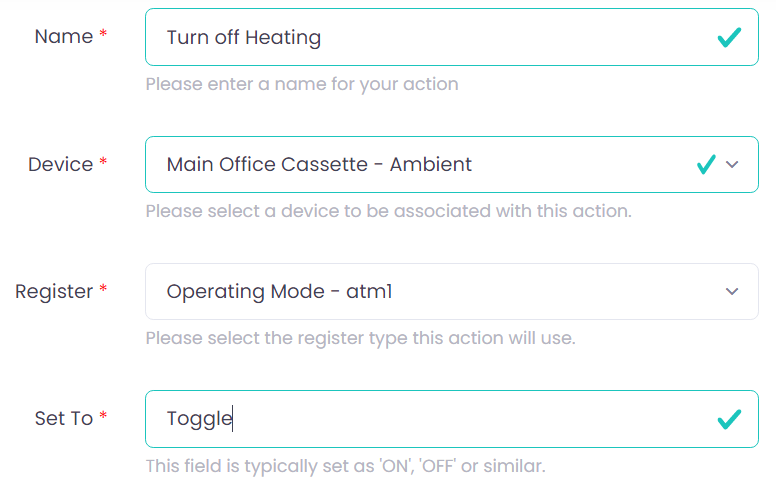 (Note: Our "Off" Action has the register atm1 being set to 'Toggle' as this will act as a "shut off" switch to the unit)